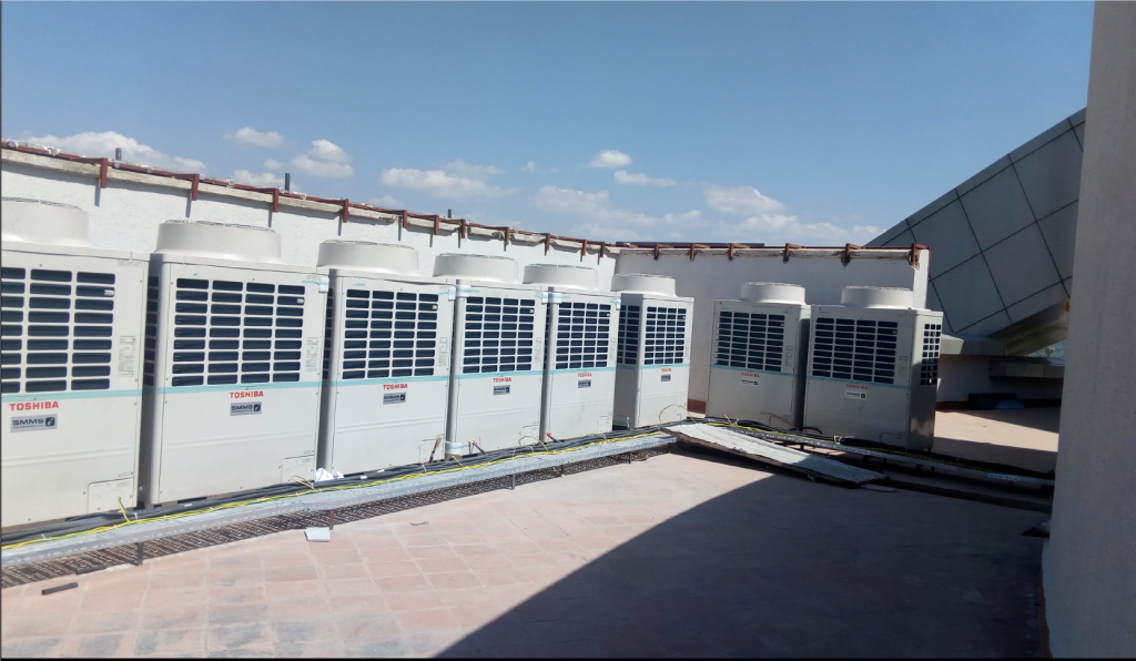 VRV Air Conditioning Outdoor Units at roof of Conference Hall building at Party HQ , Rusororo – Rwanda.